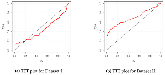 The graphical and numerical analyses of these two datasets are as follows. Figure 3 presents the total test time (TTT) plots of the two datasets. The first plot shows a convex curve, indicating that a decreasing hrf for the fitting model is appropriate for Data set I, whereas the second plot shows a concave curve, indicating that an increasing hrf for the fitting model is appropriate for Data set II. These cases are covered by the NPTLILx model, as shown in Figure 2.