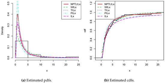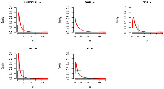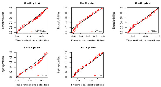 Table 8 and Table 9 present the CVM, AD, KS, and the related p-value, and the MLEs of the models’ parameters for Datasets I and II, respectively. The obtained p-values indicate that the NPTLILx model is the best. Table 10 and Table 11 communicate the , AIC, BIC, CAIC, BIC, and HQIC of the models for Datasets I and II, respectively. Since the smallest values are obtained for the NPTLILx model, it can be considered the best with these criteria. The estimated pdfs and cdfs for the considered models are displayed in Figure 4 and Figure 5 for Datasets I and II, respectively. The plots of the estimated pdfs are visually refined via an individual treatment in Figure 6 and Figure 7. In order to give another point of view, we illustrate the adequateness of the models via the use of probability–probability (PP) plots in Figure 8 and Figure 9, for Datasets I and II, respectively. In particular, for Dataset II, in view of the perfect adjustment of the scatter plot by the PP line, it is clear that the NPTLILx model provides a better fit in comparison to the other models. To resume, the NPTLILx model reveals itself to be the more appropriate model for the two datasets, illustrating its applicability in a concrete setting.