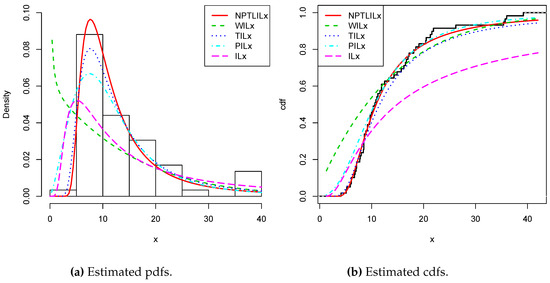 In this section, we prove the flexibility of the NPTLILx model by analyzing two practical datasets. The fits of the NPTLILx model are compared to the competitive models listed in Table 7. The common point of all of them is the use the inverse Lomax distribution as the baseline distribution.