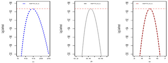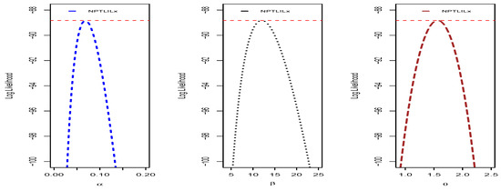 We end this section by providing some additional graphical and numerical elements on the NPTLILx model, related to the quantities presented in Section 4.1. To illustrate the uniqueness of the MLEs of , and , the profiles of the log-likelihood function are proposed in Figure 10 and Figure 11 for Datasets I and II, respectively. The Fisher information matrices of the NPTLILx model taken at the MLEs for Datasets I and II are, respectively, given by