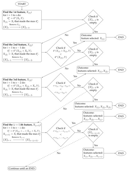 The proposed method handles feature redundancy by considering joint-distributions among features. Taking and as examples, the first step yields the feature , which is the most relevant feature (measured by the estimated CASMI) to the outcome. In the second step, we joint the selected with each of the remaining features, and we evaluate the estimated CASMIs between each of the joint-features and the outcome. The joint-feature with the highest estimated CASMI is selected, which becomes . It should be noted that and are neither necessarily independent nor necessarily the least dependent. Selecting only indicates that based on the information provided from , provides the most additional information about the outcome among the remaining features. In addition, CASMI is an information–theoretic quantity that does not use ordinal information of features; therefore, both linear and nonlinear redundancy are captured, evaluated, and considered.