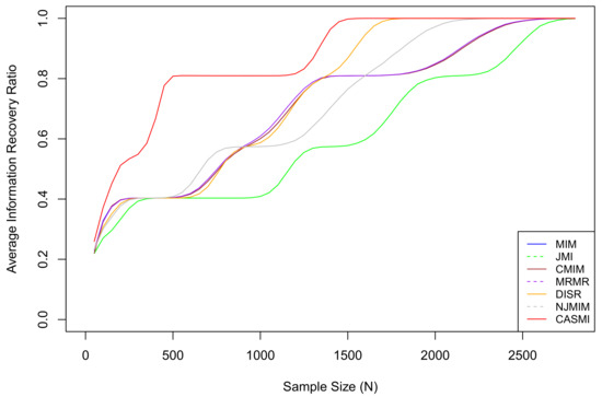 These six entropic methods all require users to set the number of features to be selected, while the proposed method can automatically decide the most appropriate number of features based on data. As we must control the number of selected features to validate the comparison of IRRs, we use the number of selected features from the proposed method as the number of features to be selected in the six entropic methods in each iteration. It should be noted that we are not claiming the number of features determined by the proposed method is correct. We set them to be the same for only the purpose of validating the comparison. As a matter of fact, the relevant features would not be entirely selected until the sample size is sufficiently large, and the threshold of a sufficiently large sample varies from method to method.
