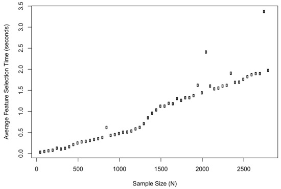 Meanwhile, we recorded the average computation time of the proposed method when implementing feature selection in R. The plot of results is shown in