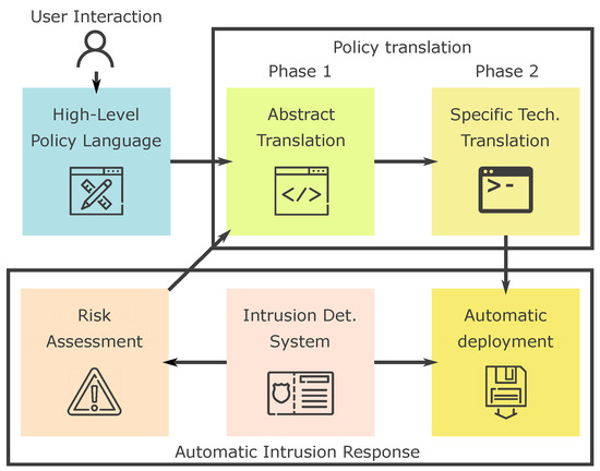 Our solution integrates different main systems which have been designed to focus on each one of the main functionalities of the solution: The high-level policy definition, the translation of policies to a low-level language, and finally, the integration of an intrusion detection system to improve the policy configuration, generating an automatic intrusion response system. In the following sections, we explain in detail each one of these systems and their functionalities.