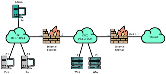 For the first validation scenario, we have designed a very common topology used in many organizations to offer internet-based services such as web pages while protecting the rest of their networks. It is based on the configuration of a DMZ (de-militarized zone) between internet access and the internal network. Firewalls are used to securely separate each network. A diagram showing the basic elements of this topology can be seen in Figure 3.
