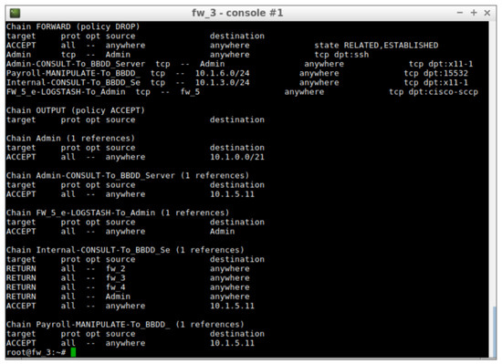 This allows automatic protection of the BBDD server by removing the permissions given in the risk level 0. After the modification of the security policies, the Iptables chains in Firewall 3 will be reduced to two, as shown in Figure 6.