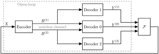 In the system, is the side information that becomes available at time-instance k at the encoder, and similarly, is the new side information at reproduction decoder i. We emphasize, this is not side information in the usual information-theoretic sense of multiterminal source coding or Wyner–Ziv source coding, where the side information is unknown, jointly distributed with the source, and only available at the decoder, e.g., some type of channel-state information [28,29]. In this paper, our encoders and decoders are deterministic. However, to allow for probabilistic encoders and decoders, we let the deterministic encoders and decoders depend upon a stochastic signal, which we refer to as the side information. To make the analysis tractable, we require this side information to be independent of the source. The side information could, for example, represent dither signals in the quantizers, which is a common approach in the source coding literature [30]. We shortly disucuss the possibility of removing this independence assumption in Section 6.