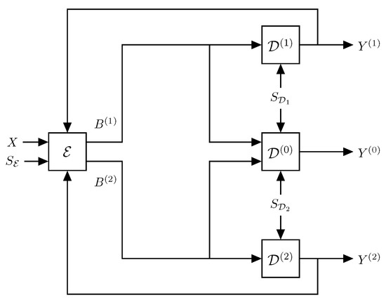 - Ozarow, L. On a source-coding problem with two channels and three receivers. Bell Syst. Tech. J. 1980, 59, 1909–1921. [Google Scholar] [CrossRef]