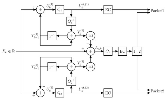 - Østergaard, J.; Quevedo, D. Multiple Description Coding for Closed Loop Systems over Erasure Channels. In Proceedings of the 2013 Data Compression Conference, Snowbird, UT, USA, 20–22 March 2013; pp. 311–320. [Google Scholar] [CrossRef]