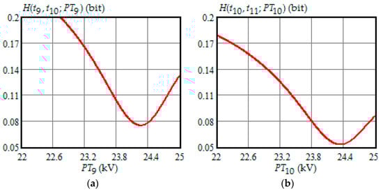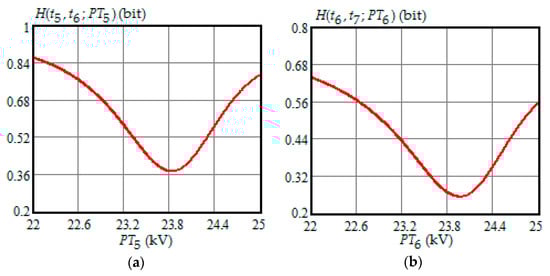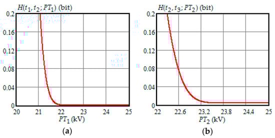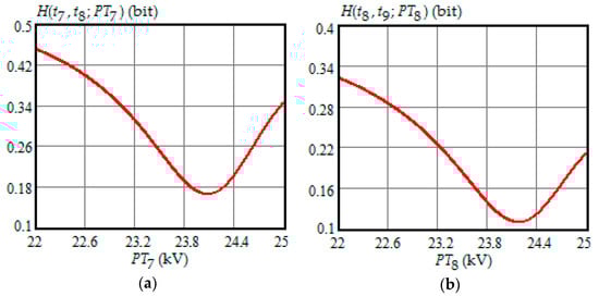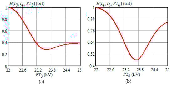 - For moments of condition monitoring and , Shannon entropy decreases with an increase in the preventive threshold and then remains constant up to the failure threshold FT. Therefore, as follows from Figure 1a,b, for the moment the value of the preventive threshold can be any in the interval (21.9, 25) kV and for the moment in the interval (23.3, 25) kV;