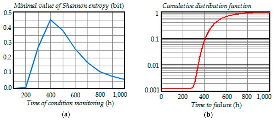 To clarify the last conclusion, let us consider simultaneously the dependence of the minimum Shannon entropy on the moment of condition monitoring and the plot of the cumulative distribution function of time to failure, shown in Figure 6a,b. As can be seen in Figure 6a,b, the entropy was nearly zero when the cumulative distribution function was close to zero or unity, respectively, at early and late inspection times.