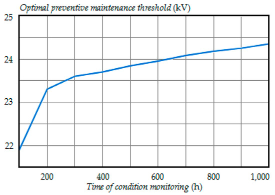Figure 7 shows the dependence of the optimal preventive maintenance threshold on the time of condition monitoring. The optimal thresholds for inspection times and corresponded to the minimal possible values according to Table 1.