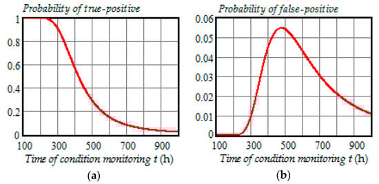 (a) Dependence of the probability of true-positive on the time of condition monitoring t; (b) dependence of the probability of false-positive on the time of condition monitoring t.