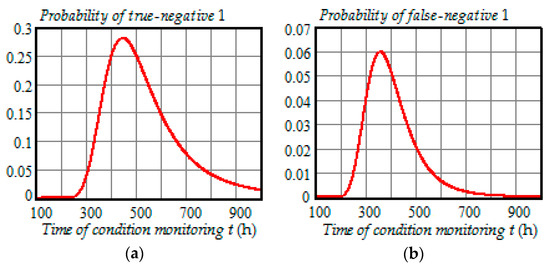 (a) Dependence of the probability of true-negative 1 on the time of condition monitoring t; (b) dependence of the probability of false-negative 1 on the time of condition monitoring t.