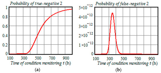 (a) Dependence of the probability of true-negative 2 on the time of condition monitoring t; (b) dependence of the probability of false-negative 2 on the time of condition monitoring t.