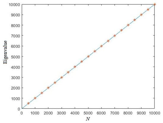 for moderate–large N. Set N = 10,000, a uniformly distributed random sequence is randomly generated. Figure 2 shows the eigenvalue of this sequence. In Figure 2, we can see that all the numerical results are near the theoretical curve we derived in Equation (15), which indicates that the expectation of eigenvalue of random real number sequences is correct.