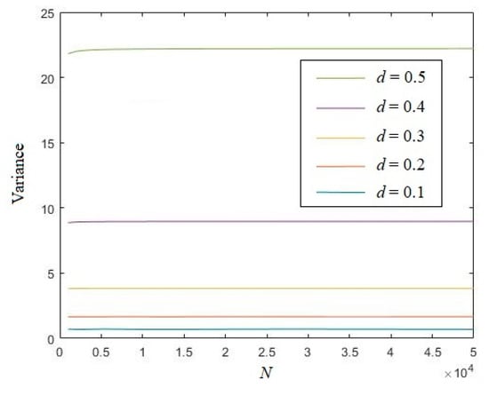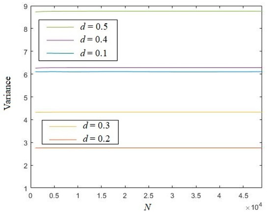Set length N from 1000 to 50,000. Figure 3 shows that for different distances d, the variances of the eigenvalue are all quite stable with the growth of length N.
