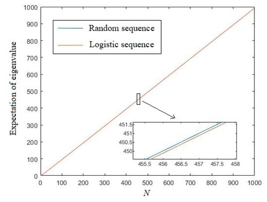 Figure 6 depicts the comparison of the expectation of the eigenvalue of logistic sequences and uniformly distributed random sequences under the same undifferentiated distance d = 0.1. In Figure 6, we can see that there are almost no differences among the expectation eigenvalue of the logistic sequences and random sequences. After enlarging, we can see that the eigenvalue of logistic sequences is just a little lower than the random sequence, which implies that the logistic sequence cannot be regarded as a perfect random sequence in this sense. For other undifferentiated distances, the results are similar. Therefore, we omit them here to avoid redundancy.