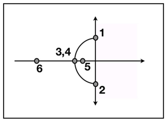 The root locus of a team’s network (for the natural frequency, we focus on energy dissipation to the left of the center point, with increasing energy to the right, ignored in this study). For Equation (6), in cases when no resistance exists (no audience; or two equal sides of an issue talking past each other), solutions fall only on the y or imaginary axis, similar to harmonic oscillations (points 1 and 2). When two equal competitors in a debate fully engage with each other before an audience with equal resistance to each, a compromise provides a solution where the y curve meets at the x or real axis (e.g., points 3,4). When the audience selects one argument to dominate the other, the root locus falls on the x axis without oscillations (solution 6 represents strong resistance).