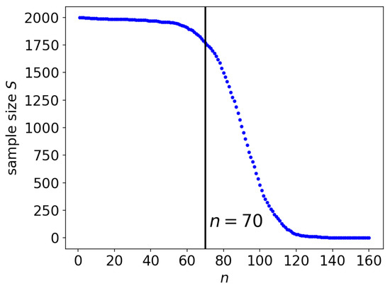 Using all of the observations, the upper and lower bounds can be estimated with Equation (5) for every n. The number of collected observations varies with respect to n, as shown in Figure 2. Figure 4 shows the plots of the upper and lower bounds computed for using all of the collected observations. The blue plot indicates the upper bound, whereas the red plot shows the lower bound. For the upper bound, the blue plot exhibits a decreasing tendency, although the values fluctuate along with n. Our main interest lies in the upper bound.
