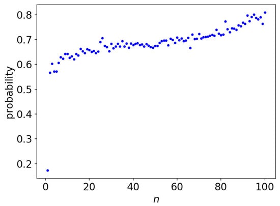 Figure 3 shows the probability that a subject provided the correct n-th character with their first guess. At (i.e., the subject was asked to predict the first character of a phrase with no context given), the probability was below 20%. The probability improved greatly from to , as it reached above 50% for . As n increased to , the probability roughly monotonically increased to nearly 80%. Based on this result, a subject improves their accuracy in predicting the next character as the context length n increases, at least up to , which supports Shannon’s claim.