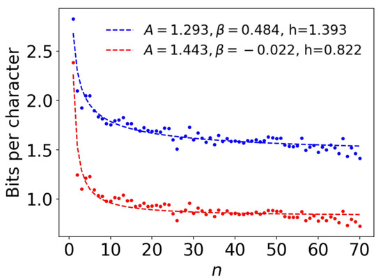 For and , the fits converged well and the errors were also moderate. The mean-root-square error of was , quite close to the error of , which was . Both the entropy rate estimates also converged to similar values of h; namely, and bpc, respectively, for the upper bounds. The values of , were and for and , respectively, suggesting monotonic decay in both cases.