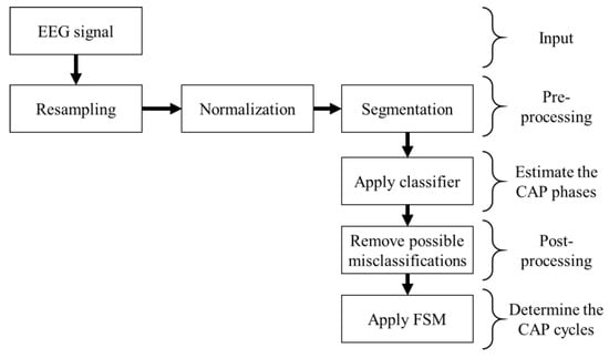 A common practice for CAP phase detection consists of the analysis of the characteristic EEG frequency bands to extract features such as band descriptors [18,19]; Hjorth activity [20]; discrete wavelet transform to estimate an activity index [21]; similarity analysis [13]; tunable thresholds applied to the EEG signal [22]; differential variance [23]; Teager energy operator [24]; Lempel–Ziv complexity [25]; Shannon entropy [26]; empirical mode decomposition [26]; sample entropy [25]; Tsallis entropy [25]; fractal dimension [25]; and log-energy entropy [16].