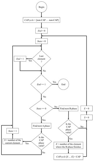 The protocol followed to classify the CAP cycles was defined by Terzano et al. [5]. A FSM was implemented to classify the CAP cycles, since the protocol is a rule based method and each rule can be applied by a group of states at any given time. The algorithm flowchart is presented in Figure 3 and the goal is to correctly determine the elements of a vector (named CAPcycles) whose length is equal to the number of epochs that were classified.