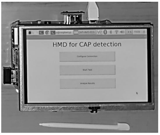 The objective was to develop a low cost minimally invasive HMD for automatic CAP detection, using the model that achieved the best performance (LSTM and FSM) to perform the predictions in the processing unit, analyzing the signals that were measured in the sensing unit. The two units wirelessly communicate by Bluetooth, allowing the sensing unit to be small (since minimum processing is needed) and easily self-assembled. The processing unit has a touchscreen that displays the graphical user interface (GUI), presented in Figure 4, where the user can configure the connection, start/stop the exam and analyze the results.