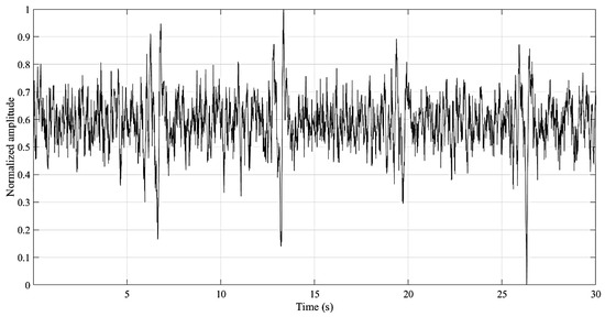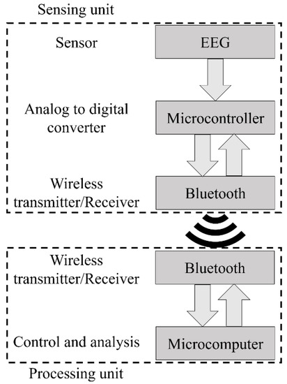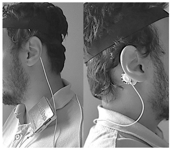 The ECG sensors detect the electrical potentials (through the electrode) in the scalp with respect to a ground reference (ground cable), and it was verified, when comparing with an established gold standard device (BioPac MP35 Student Lab Pro), that the average measurement root mean squared error was 0.013 ± 0.005 [58]. This small error advocates the viability of the sensor for clinical diagnosis. An example of the recorded signal is presented in Figure 7. The input noise, common mode rejection ratio and the input impedance of the amplifier employed on the EEG sensor are 50 nV/√Hz, 100 dB and >100 GOhm, respectively.