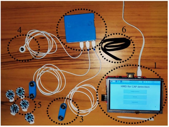 The processing unit is composed of a single-board computer (Raspberry Pi 3 B+ with 1.4 GHz, 64-bit, ARM quad-core processor), fed by the DC power supply, and a touch screen that displays the GUI where the user interacts with the developed Python application that automatically connects with the sensing unit once it is opened. The applications allow the user to change the ADCs that will be used and specify a new bit rate for the Bluetooth communication (the default value is 19,200 bits/s). However, for the typical examination, the user just has to follow these steps: (1) place the EEG sensor in the C4 or C3 positions (the other EEG sensor, connected to the second ADC, can be placed in another location of interest for clinical diagnosis, such as Fp1 or Fp2, but it will not be considered for the device CAP detection), according to the 10–20 international system; (2) tighten the headband around the sensor to decrease the measurement noise; (3) place the ground electrode in the mastoid region (A1 if the EEG sensor was placed on C4, or A2 otherwise); (4) turn on the sensing unit; (5) turn on the processing unit and wait until the “HMD for CAP detection” application is open; press in the “Start Test” button (a new window will appear with the “Stop Test” button); (6) when the test is finished press the “Stop Test” button (all the information that is received in the sensing unit is stored in a text file with a timestamp on the 32 GB secure digital memory card); (7) press the “Analyze Results” button (the application opens the text file, stores the signal in a variable and uses the developed algorithm for CAP detection) and wait until the “Finished Analyzing the Results” message is displayed (the predicated CAP phases and cycles are stored, with a timestamp, in a text file).