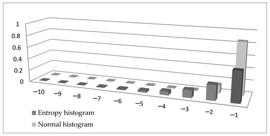 The similarity between Formulas (15) and (16) is obvious. There is a minus sign in Formula (15) to make sure the tail entropy is a positive measure. More importantly, while the entropy is a weighted sum of log probabilities, the ES is the weighted sum of observations in the tail. To visualize the difference between the two formulae, in Figure 1 we compare the left tail of a histogram of a variable distributed N (0,1) (normalized with the tail probability and using bins of width 1) with the left tail of a histogram built using the entropy measure. In Formula (15) we can denote by xi, giving , and this probability is presented in Figure 1 in the entropy histogram. It can be seen that the probabilities calculated using entropy are higher (except for when using the value −1) than the probabilities in the normal histogram.