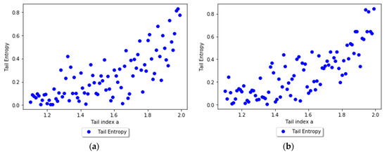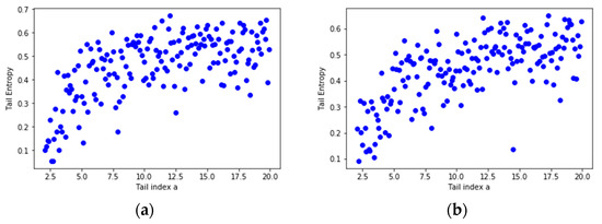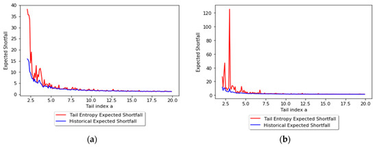 In order to assess the relationship between the tail entropy and the historical expected shortfall (ESH), we simulate random variables , with . Figure 3 presents the relationship between TE and tail index a using scatterplots for different levels, i.e., 1% and 2.5%, of α. As the a parameter of the simulated distribution decreases, the tail entropy of the distribution decreases, too; as expected, high tail entropy values are associated with heavy-tailed distributions. Figure 4 presents the relationship between TE and historical ES, as functions of the a parameter of the simulated distribution, for 1% and 2.5% levels of α.