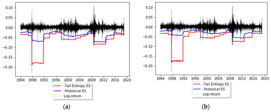 The illustration of tail-Entropy-based ES in Figure 6 indicates that at similar backtesting rejection rates tail-entropy-based ES seems to lead to overly high risk quantifications; in addition, the time to recover from a bad shock (like Black Monday on 19 October 1987) is much longer than for historical expected shortfall (which itself usually leads to long recovery times). These two observations seem to indicate that the proposed entropy-based version of expected shortfall tends to react fiercely in the presence of outlying observations. This may be a sign that tail-entropy-based ES is a more conservative risk measure than traditional ones due to the way it is defined, as it takes into account the tail distribution, which has a higher inertia and a longer recovery time from a negative shock.