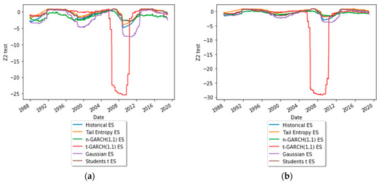 To get an insight into the dynamic behavior of the test statistics of the backtest, Figure 7 depicts time-varying test statistics (using a rolling window of length 1000) for ES estimated at significance levels α = 1% and 2.5%. As can be seen, the expected shortfall estimated with the Student’s t-GARCH(1,1) model underperformed, for both α levels, during the financial crisis of 2008.