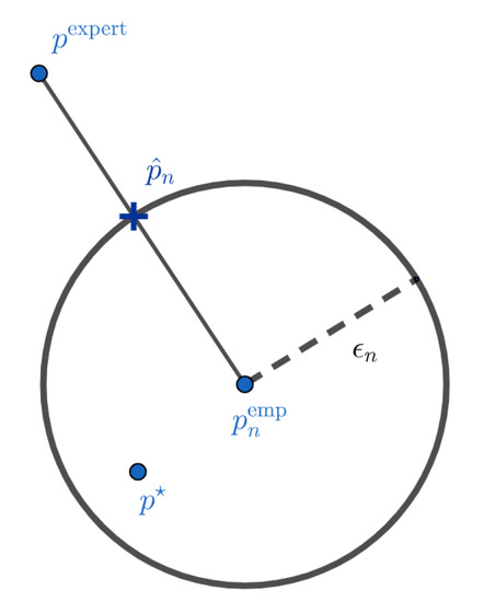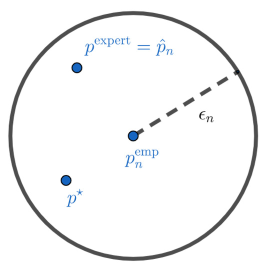 Such a formulation has several advantages over the maximum likelihood with entropic penalization approach previously proposed in [1]. First, we do not have to choose a regularization parameter, which seems to have a strong impact on the results of the estimator (see [1]). This parameter is replaced by the parameter , for which it is reasonable not to take more than and which appears to have low impact on the result of (see Section 5). Secondly, the solution of (6) can be (depending on the choice of the dissimilarity measure ) easier to compute than that of the optimization problem associated with the penalization approach, for which a closed form of the solution could not be derived [1]. Mathematically, is the projection of the experts on the confidence interval centered on the empirical distribution and radius . Figure 1 and Figure 2 give a visual interpretation of such a construction. These representations should not be taken literally. The objects we work on live in the simplex of probabilities, and their geometry is very different from the Euclidean interpretation of Figure 1 and Figure 2. These figures are mainly here to illustrate the two different cases we can have. In Figure 1, we do not have much data and the confidence interval is wide. In this case, the projection of the experts on the confidence interval centered on the empirical distribution is the expert distribution itself. We do not have enough elements to modify our initial a priori. This case can also occur when the initial a priori of the experts is very close to the true distribution. On the contrary, in Figure 2, we modify the initial a priori because the experts do not belong to the confidence interval anymore.