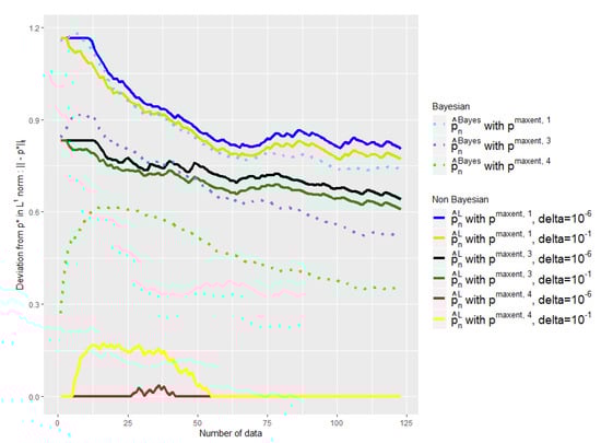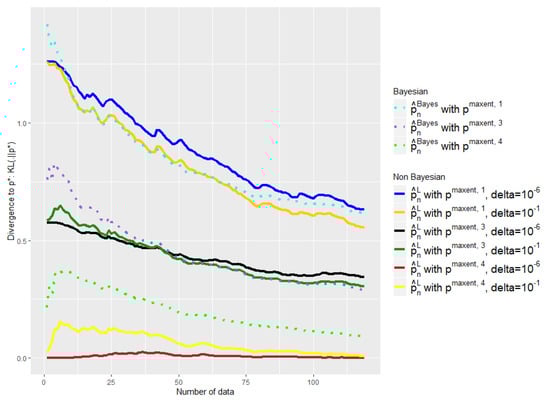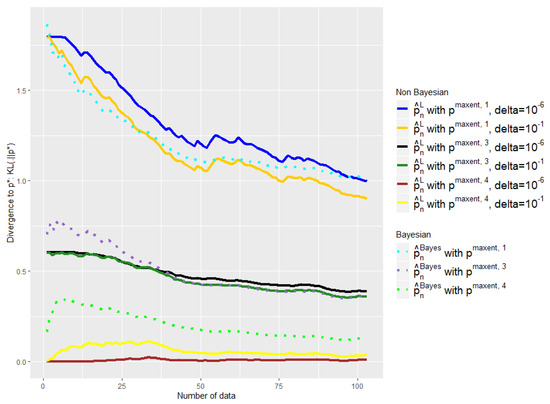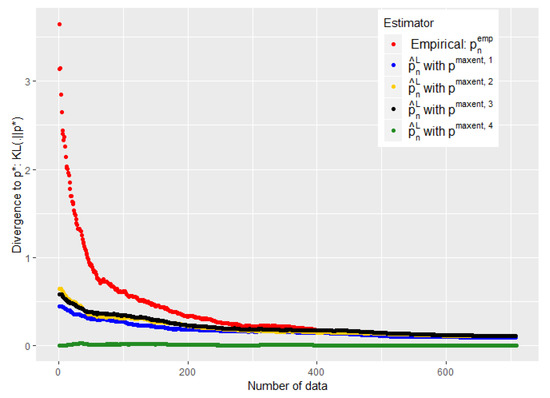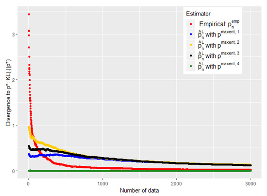 First, when making a binary choice of model, it is not that easy to determine when we should jump from the expert model to the empirical model. Note also that it would produce an undesirable discontinuity in the function of the data flow. Most importantly, it is crucial in our application that our estimator has the same support as the real distribution. It would be disastrous indeed to consider that a disease is impossible because we never observed a particular combination of symptoms. This remark is somewhat linked to the well-known coupon collector’s problem: How many samples do we need on average to observe all the modalities of the support of a given distribution at least one time? In the equal case (the target distribution is uniform), the average number of samples needed is of the order of , but it might be much more in the unequal case [32]. Nevertheless, let us emphasize here once again that we are particularly interested in the moment where we have little data. Then, the empirical distribution alone will never be a really good alternative. We could, of course, consider a Laplace smoothing in order to avoid this difficulty, but this would be nothing more than a less sophisticated maximum entropy approach.