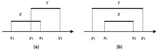 Unfortunately, this approach does not provide the separated interval equality relation, because for , i.e., from (5), we get . In the literature, interval equality relation is sometimes treated as identity [], or only in conjunction with interval inequality [] or even as an impossible relation []. On the other hand, in accordance with the classical definition [], an interval X is entirely represented by its bounds (). Therefore, the interval X may be considered as a mathematical object completely defined by the pair . Then it is clear that if we have two such objects X and Y defined by equal bounds () we can declare that X and Y are equal intervals.