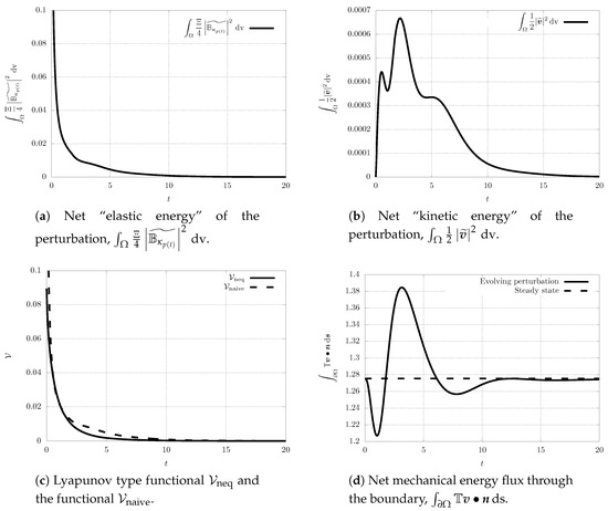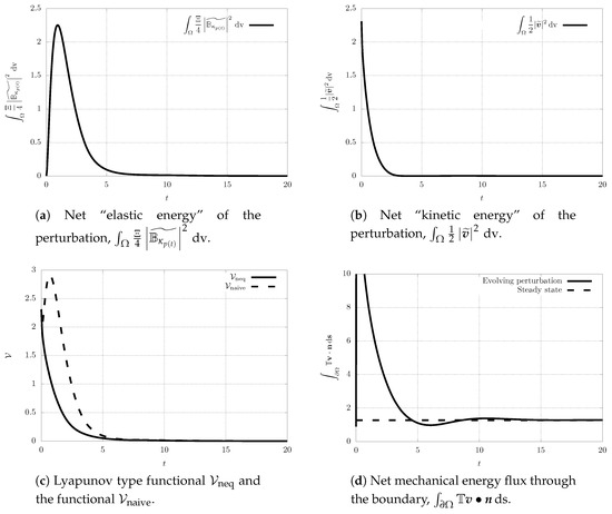 While the concept of Lyapunov type functional is very simple, it is difficult to apply in a particular setting. The main difficulty is to find a Lyapunov type functional. (Note that in the infinite dimensional setting one can not easily exploit LaSalle’s invariance principle since it requires precompactness of the trajectories, which is a qualitative property that goes beyond our assumption regarding the existence of the classical solution. Consequently, having a Lyapunov type functional with Equation (26b) replaced by the mere negativity everywhere except at the equilibrium, for , is not a viable option.) Fortunately, since we are interested in equations describing a physical system, we can try to search for the functional using physical concepts.
