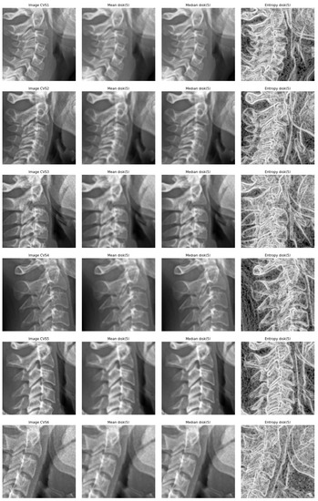 - A cropping of images of the size 512 × 512 to the specific informative part of cervical vertebra and possibly resizing them to 256 × 256 for reducing the computational costs are enough. However, to improve more, we tried different pre-processing of the images: mean, median and entropic filter to the images.