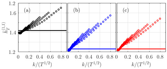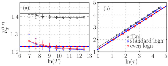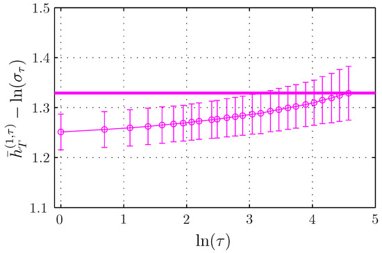 We report in Figure 1b,c the evolution of the ersatz entropy rate of the Hermitian and the even-Hermitian log-normal processes in function of . We observe exactly the same behavior as for the fBm: the entropy rate converges to , the entropy of the log-normal process at unit-time (horizontal blue/red line in Figure 1b,c). If X is a log-normal process of mean and standard deviation , then the process is Gaussian with the mean and the standard deviation and the entropy of X can be expressed as [16]. Figure 1b,c thus gives an estimation of the bias of our estimator, which appears to be the same as for the fBm.