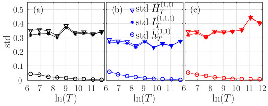 We report in Figure 2b,c the behavior of the standard deviation of the estimators. Again, exactly as for the fBm, the standard deviation is large for the ersatz entropy and the ersatz auto-mutual information, while it is much smaller for the ersatz entropy rate.