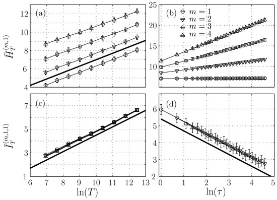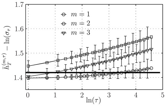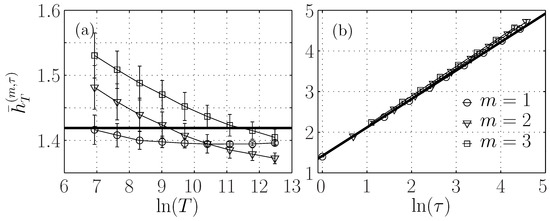 Figure 4b shows that for a fixed window size , the ersatz entropy rate is proportional to . We have added a black line defined by the linear function , as suggested by Equation (34) without the corrective term. This black line perfectly describes the evolution of the entropy rate with the scale , which is independent on the embedding dimension m.
