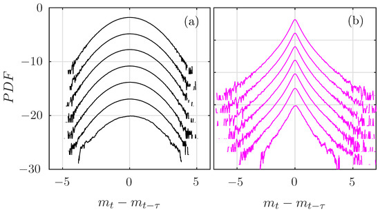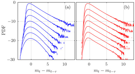 Probability density function (PDF) of the increments of the (a) Hermitian and (b) even-Hermitian log-normal motions of size , from (bottom) up to (up). Curves have been arbitrarily shifted on the Y-axis for clarity.