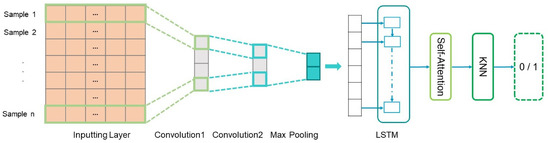 In this experiment, the dataset was divided into the training set (60%), test set (20%), and validation set (20%). The learning of the CHRNN (without a self-attention mechanism) and CHRNNA framework (with a self-attention mechanism) was carried out for 200 epochs and a mini-batch size of 128 samples. Layer 1 with a convolution operator has 13 filters of size 1 × 2; Layer 2 with a convolution operator contains 26 filters of size 1 × 2, followed by a max-pooling layer. The max-pooling layer has a kernel size 2 and stride step 1. The dimension of the LSTM layer is 64. The dropout rate was set to 0.5 to prevent overfitting. For the binary classification problem, we adopted the sigmoid activation function. We employed binary cross-entropy loss on sigmoid function and the Adam optimization method, which works better to avoid the gradient vanishing/exploding issues. In the final classification stage, we studied different values of the number of neighbors k. More precisely, the k value considered is 7. Table 3 lists our hyper-parameter setting.