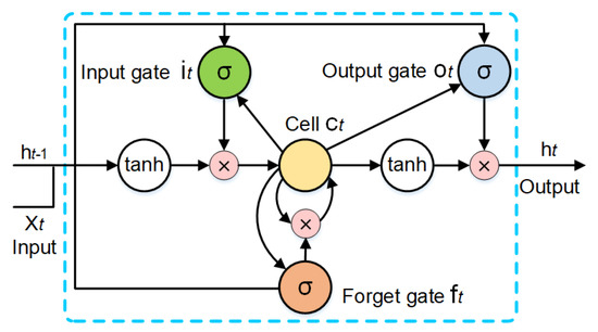 LSTM is a kind of neural network architecture that is especially adapted to model sequential information. As illustrated in Figure 2, LSTM includes an input gate, a forget gate, and an output gate. LSTM networks tackle the problem of long-term dependencies of features via enhancing a memory cell at each time step t. We used LSTM to model the contextual dependencies and semantic relevance from our datasets, as shown in Figure 1.