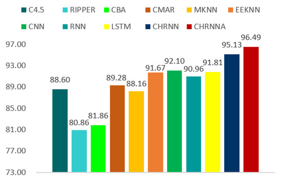 The running time of the EEKNN algorithm took 52.04 s, while CHRNNA was almost six times faster, 8.89 s. The total running time of the MKNN algorithm is the lowest. The running time in seconds shows that the CHRNNA method is significantly faster than the MKNN and EEKNN algorithms. Although our proposed method is somewhat slower than several methods in running time, it has a significant performance improvement in terms of acc, P, R, and F1 evaluation indices. With the continuous improvement of computing power, it can make up for the lack of response time. Thus, the difference in running time is negligible. Combining comparison results in terms of acc, P, R, F1, and running time, we can conclude that the CHRNNA method is more effective than the compared algorithms.