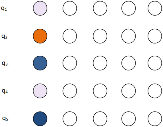 Figure 3 depicts the initial configuration of a qubit register. The register resides at the leftmost part of the two dimensional grid. Same colors indicate that the two qubits will be the input to the same quantum gate.