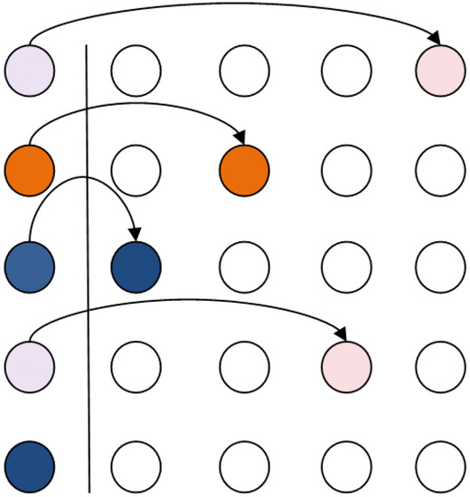 Figure 4. Applying the algorithm for grid rearrangement in an example configuration. Qubits of the same color will partake in a single two-qubit operation. The leftmost column is the initial configuration, after the transposition the qubits are teleported to the right in the position indicated by the corresponding color.