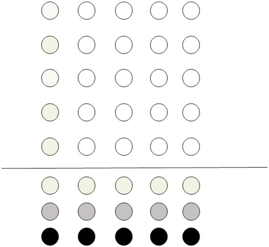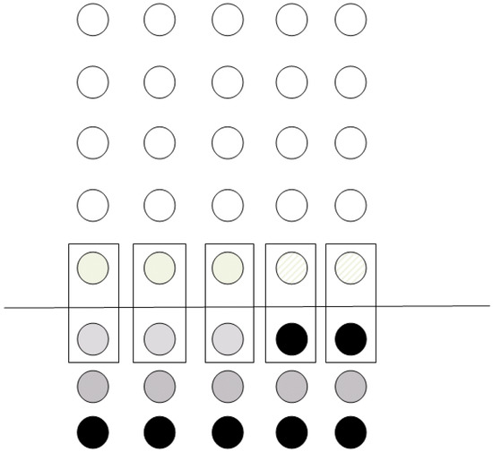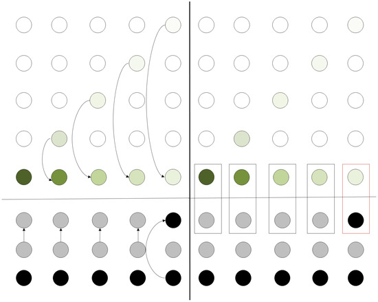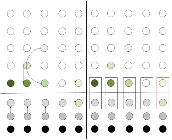 To begin with, we consider the state of the register where each qubit is in an unknown superposition which depends on the previous computational steps. For the case of a five-qubit register, this is depicted in the left side of Figure 10. Each qubit is represented with a different shade of green color. This shade is used to mark the position of the qubit throughout the computation and is not representative of the qubit’s state.